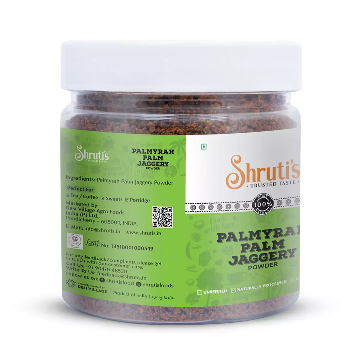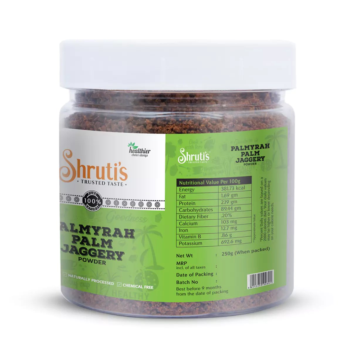 Shrutis Palmyra Palm Jaggery Powder is an Authentic Palm Powder made from Palm Sap or Palm Dew (Borassus flabellifer SAP). It is prepared using Traditional methods without adding any chemicals or preservatives to retain the Natural Mineral salts of the Palm Syrup. Palmyra Palm Jaggery Powder is also Rich in Essential B Vitamins, Zinc, Iron and Potassium. Palmyra palm is the only known Plant generated natural source of Vitamin B12. The lower GI (Glycemic Index), Minerals, Vitamins and Medicinal properties make it a “Nutraceutical” product.