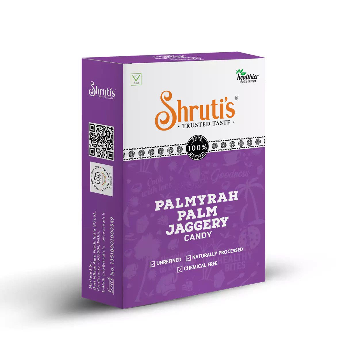 Shrutis Palmyra Palm Jaggery Candy is an Authentic Jaggery Candy made from Palm Sap or Palm Dew (Borassus flabellifer SAP). It is prepared using Traditional methods without adding any chemicals or preservatives to retain the Natural Mineral salts of the Palm Syrup. Palmyra Palm Jaggery Candy is also Rich in Essential B Vitamins, Zinc, Iron and Potassium. Palmyra palm is the only known Plant generated natural source of Vitamin B12. The lower GI (Glycemic Index), Minerals, Vitamins and Medicinal properties make it a “Nutraceutical” product.
