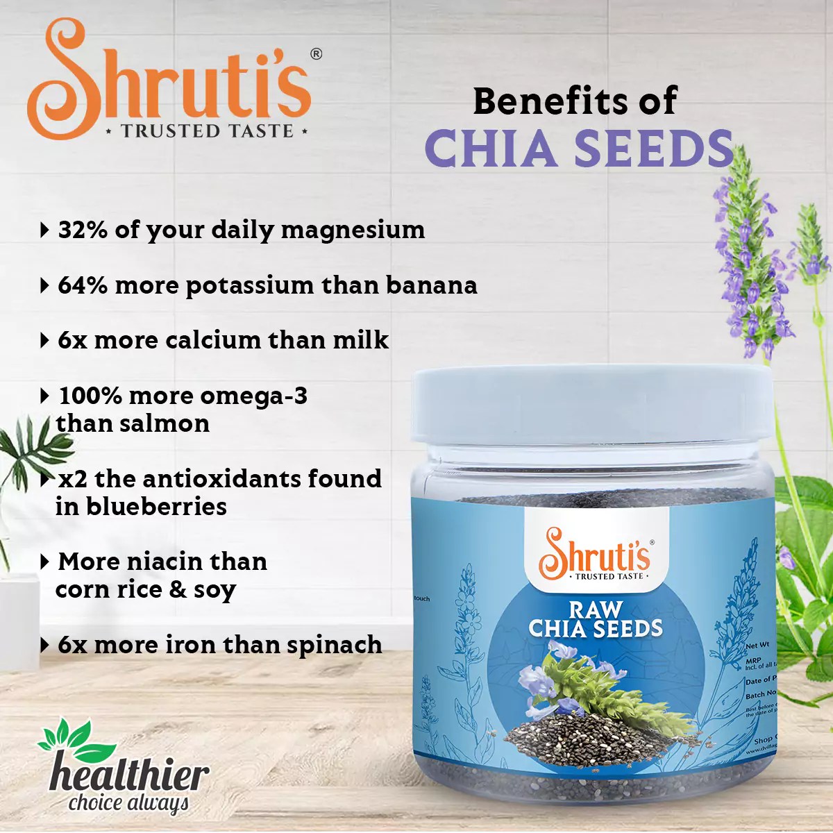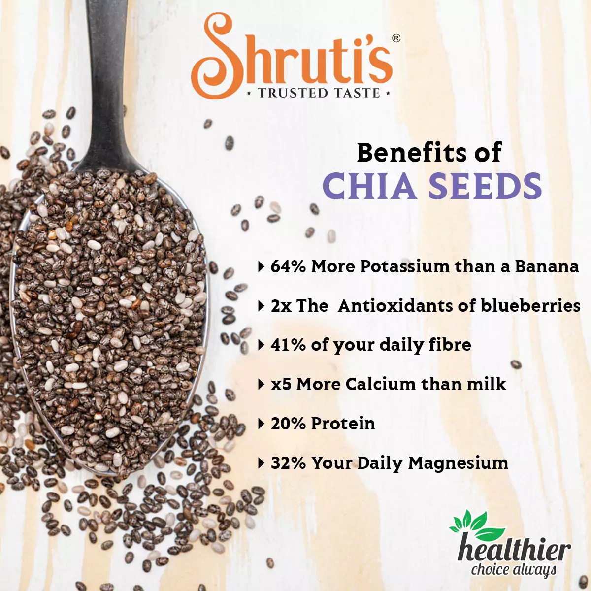 Chia seeds may be small, but they’re incredibly rich in nutrients. A staple in the ancient Aztec and Maya diets, these seeds has been used for their health benefits for centuries. The antioxidants, minerals, fiber, and omega-3 fatty acids in chia seeds may promote heart health and support strong bones. Add them to smoothies, shakes, cold beverages, Nutri bars, also sprinkle them over your salads, breads, cereals or eat them just raw.